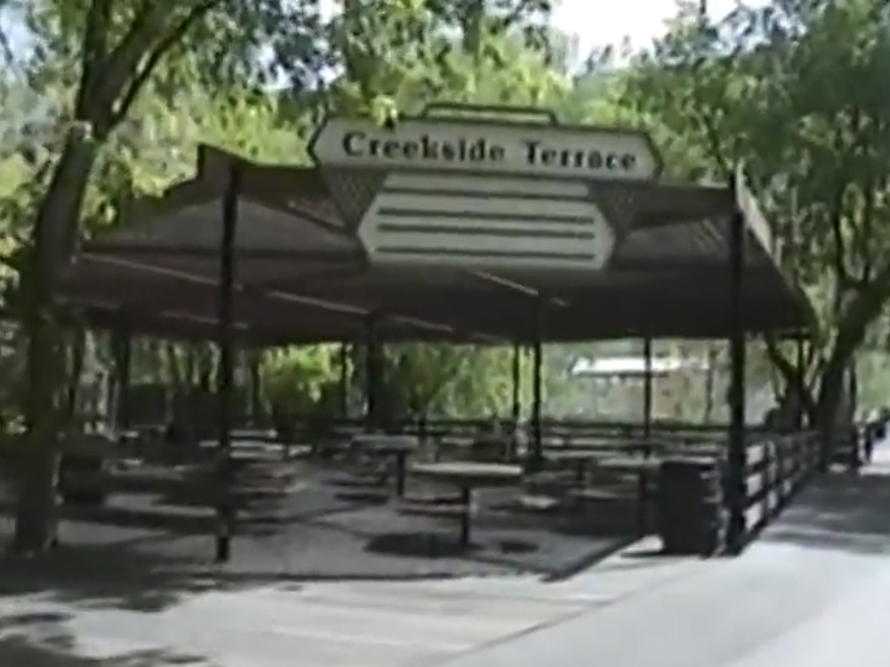 These terraces were east of the Old Mill and south of the Log Flume. They were pretty much one terrace split in half. This was mainly an eating area used by patrons of the Old Mill, but it was available for groups to reserve until 1999. In 2016, the latticework overhead structure and hanging plants were replaced by a large steel shelter.