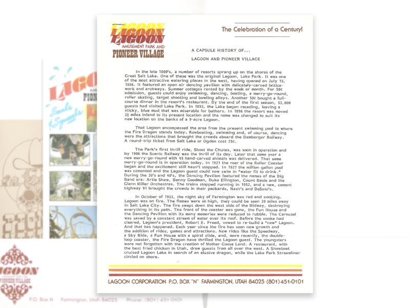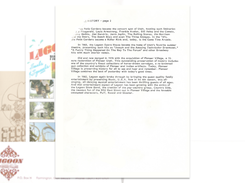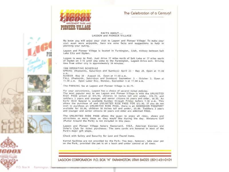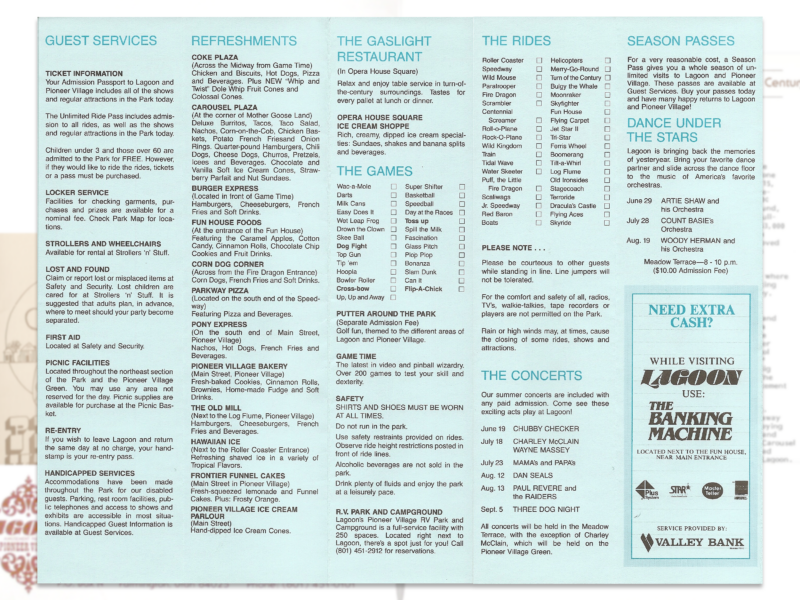 There were no new rides at Lagoon in 1988 (two were added the year before and Lagoon-A-Beach was under construction) but they made up for it with one of their busiest entertainment schedules ever. In addition to the usual musical shows, marching band, Wild West Shoot-Out and plays at the Opera House, there were also live concerts by world-renown musicians like Chubby Checker, The Mamas & The Papas, Three Dog Night and others. Not to mention a new outdoor theater that featured professional high divers.