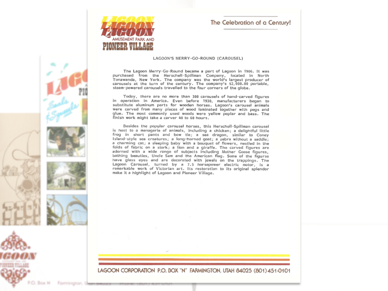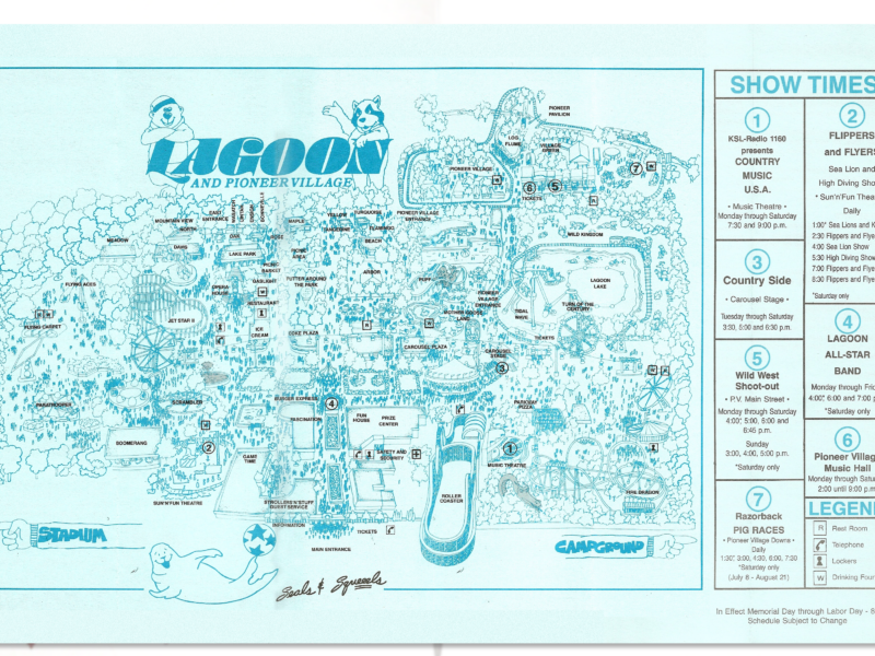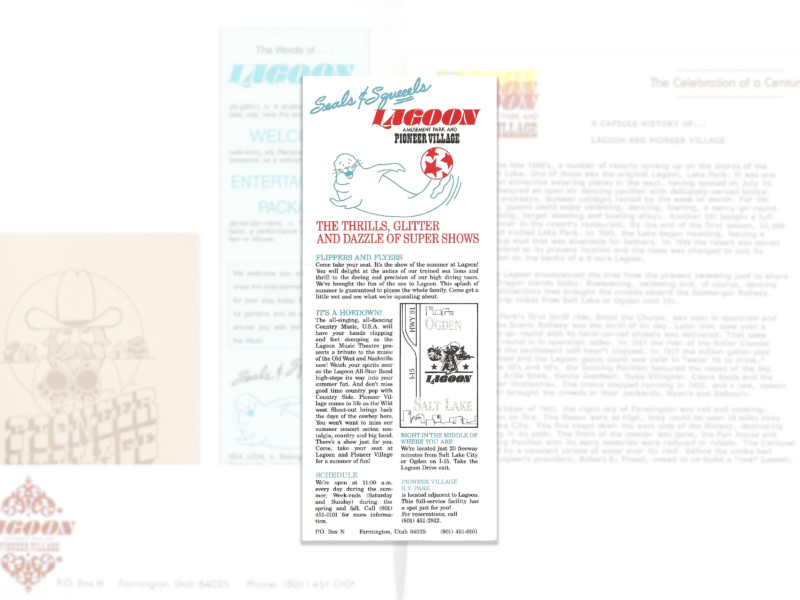The new Sun ‘N’ Fun Theatre was built between Game Time and Lagoon Stadium, where Sky Coaster is today. There had been high diving shows at Lagoon before but this was the first time they were held regularly at a permanent venue. There were also sea lion shows at the theater. Because of this and the pig races in Pioneer Village, 1988 was advertised as the summer of “Seals & Squeeels” at Lagoon.